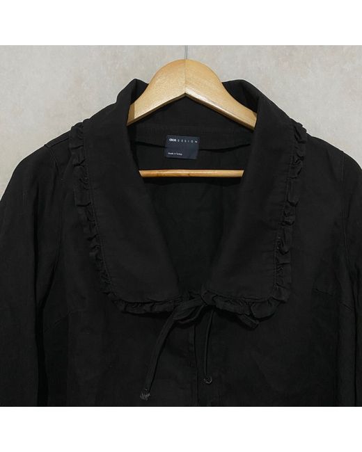 Crafted by ASOS, this black tie-front jacket is a versatile addition to any wardrobe. The piece features a collared design, long sleeves, and a regular fit, tailored to flatter while providing comfort. Its solid black hue ensures it can be paired effortlessly with a range of outfits, making it an essential for both casual and more formal occasions. The jacket is made from durable polyester, offering both insulation and ease of care as it is machine washable. Its short jacket/coat length adds a modern touch to the basic jacket style, while the tie closure adds a subtle sophistication. This garment, available in size medium (12-14), is not handmade and does not offer personalisation. Each purchase includes one unit of this stylish and practical jacket.