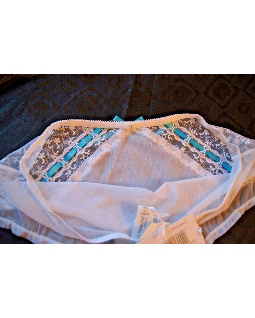 From Panache Superbra white Lilly shorts with a aqua blue ribbon running through the diagonal panels which have embroidered leaves in white across fine white net, these ribbons run up to the centre front where there is a aqua blue satin bow.