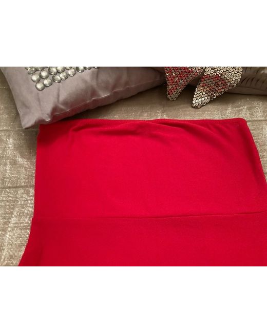One dress is solid red and the other is nude/pink in colour, made of a polyester blend crepe fabric. They feature a square neckline, strapless sleeve style, and side split accents. The dresses are bodycon style with a bandeau design, suitable for party or cocktail occasions.