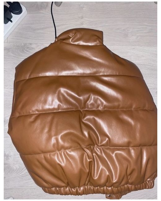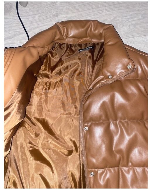 This is a stylish brown puffer jacket with a glossy, leather-like finish. It features a snap-button closure and a folded collar, offering both warmth and a trendy look. The design includes elastic cuffs and a quilted texture for added comfort and insulation.