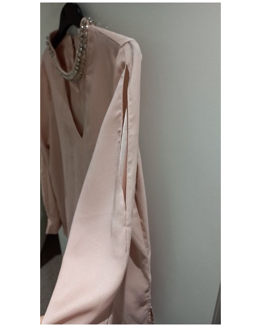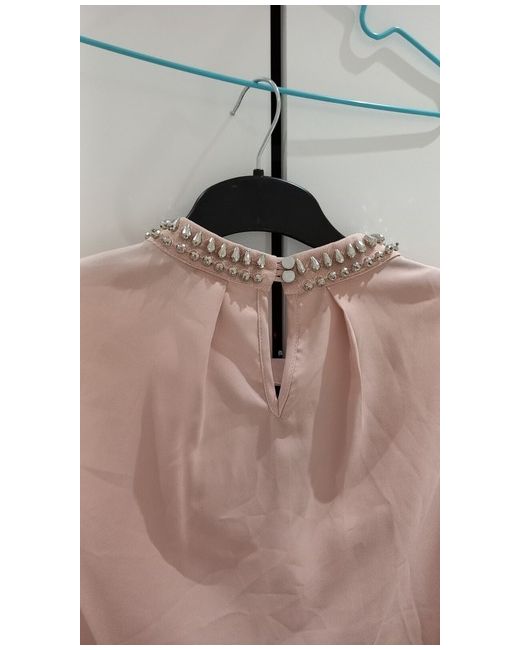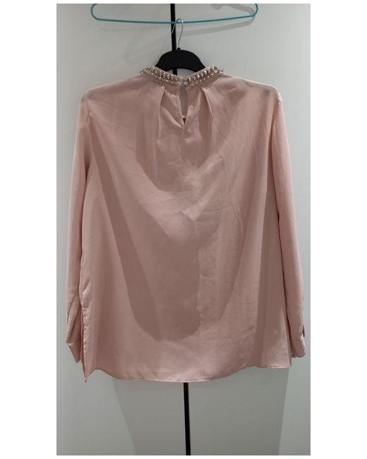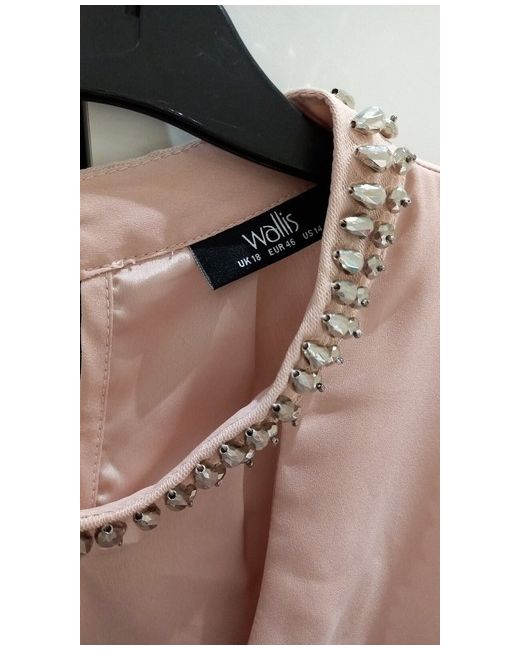 Very rare, t his stunning Wallis blouse is the perfect addition to your wardrobe. The pink satin material is accented with a beautiful beaded collar, adding a touch of glamour to any outfit. The long slit sleeves and collared neckline make it suitable for both formal occasions and casual wear.