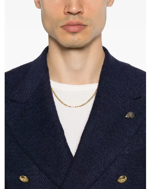 navy blue double-breasted button fastening chest welt pocket two side patch pockets English rear vents