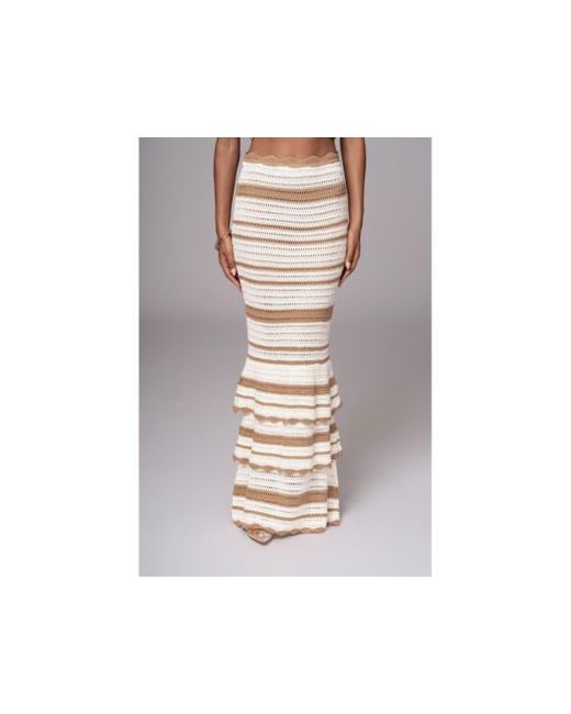 Indulge in luxury with our Corazon Ruffle Skirt Set. Crafted from a crochet knit fabric, this two-piece skirt set features an elegant striped design in shades of ivory and yellow. The crop top comes with scalloped trim shoulder straps that can be styled an off the shoulder. The matching skirt features an elastic waistband and ruffle tiers with scalloped trims for a finishing touch. Sold as set.
