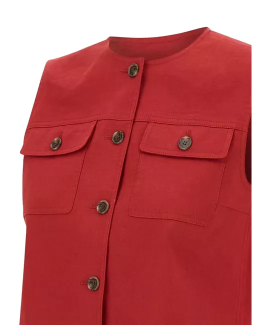 ruby red front button fastening chest flap pockets round neck sleeveless