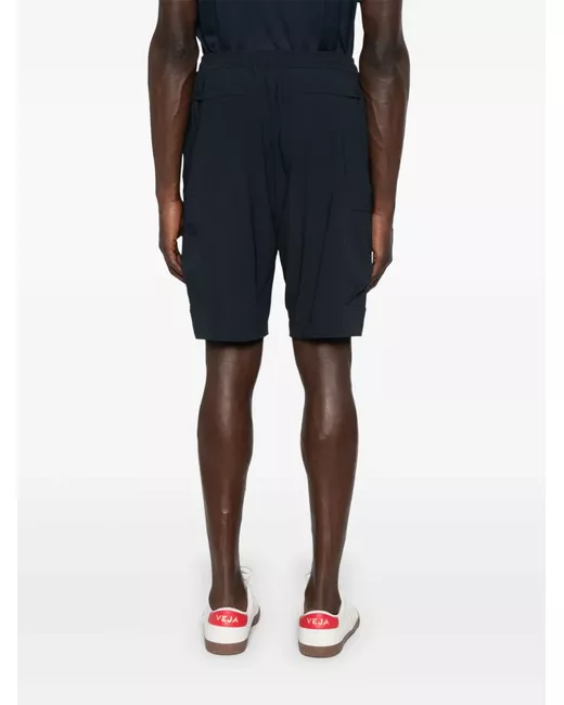 navy blue concealed front fastening elasticated drawstring waistband two diagonal pockets to the sides two side cargo pockets