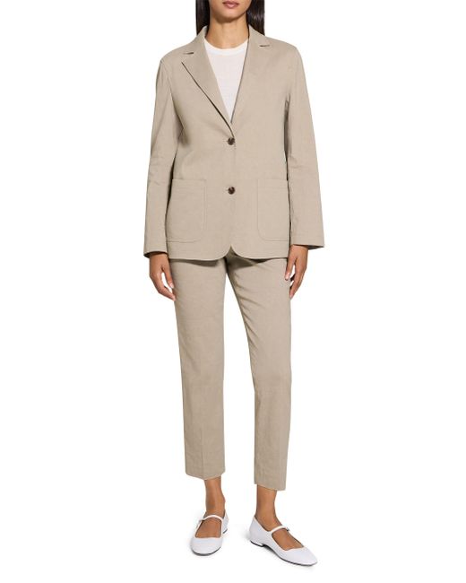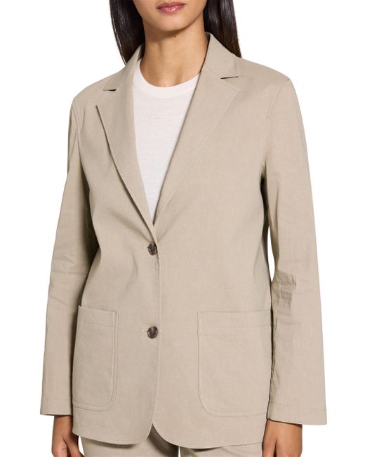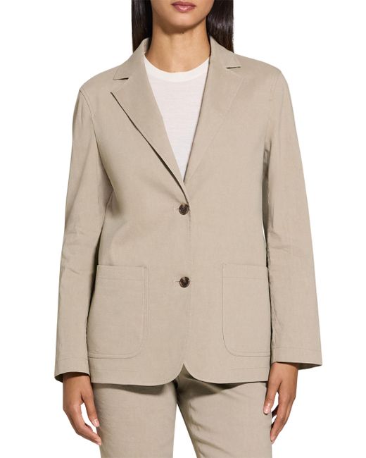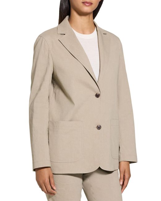 Crafted of a linen blend, this relaxed-fit Theory jacket is detailed with notch lapels, side patch pockets, and a single-breasted button-front closure. Notch lapels Long sleeves Side patch pockets Single-breasted button-front closure 62% linen/36% viscose/2% elastane Dry clean Imported SIZE & FIT About 26.75" from shoulder to hem Model measurements: 5'10" tall Model is wearing US size 4 ABOUT THE BRAND In 2000, founders Andrew Rosen and Elie Tahari launched Theory with a focus on innovative, comfortable stretch pants for women. Since then, the New York-based brand has become well-known for its mastery of polished, well-tailored separates for women and men. Contemporary Sportswear - Theory Sportswear > Theory > Saks Fifth Avenue > Barneys. Theory. Color: Soft Taupe. Size: 00.