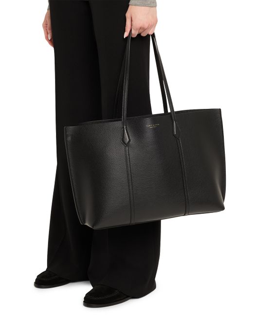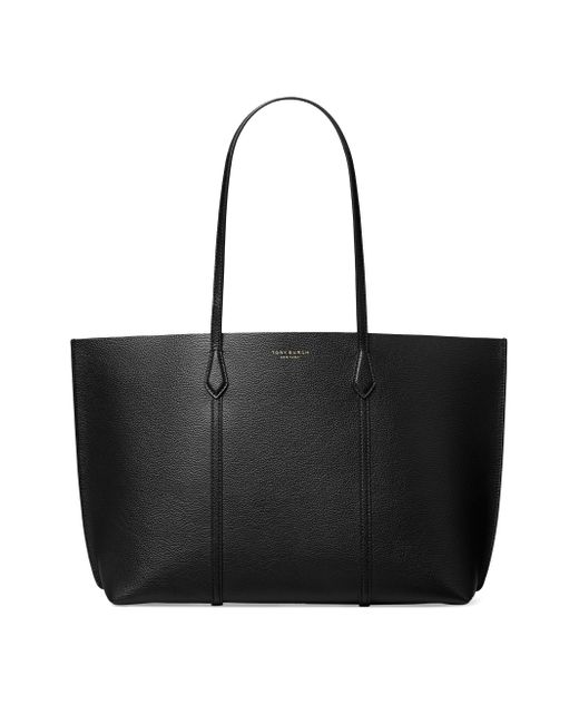 The Perry tote bag from Tory Burch is crafted of supple leather and adorned with a logo stamp. Shoulder straps Interior: one flap pocket Top zip closure Leather Lining: cotton Imported SIZE About 14.9"W x 11"H x 5.3"D Shoulder straps: about 10.2" drop ABOUT THE BRAND Since debuting her brand in 2004, New York-based designer Tory Burch has made an impact on the fashion world with her handbags and shoes, and playful-yet-polished clothing. Today, Burch remains inspired by color and travel, with her vibrant collections bursting with prints, and her instantly recognizable double-T logo drawing from Moroccan architecture. Handbags - Tory Burch Handbags > Tory Burch > Saks Fifth Avenue > Barneys. Tory Burch. Color: Black.