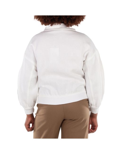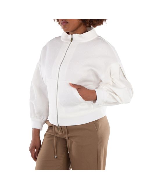 Max Mara Ladies Outerwear. Fashion category: Coats & Jackets. SKU: GASTONE004. Color: White. Max Mara Gastone Logo-Jacquard Jacket. The Gastone jacket is crafted from a cotton blend with an all-over jacquard logo motif, featuring a stand-up collar, drop shoulders, long puff sleeves, ribbed cuffs and hem, two front pouch pockets, and a front two-way zip fastening. Cotton 65%, Polyamide 35%.