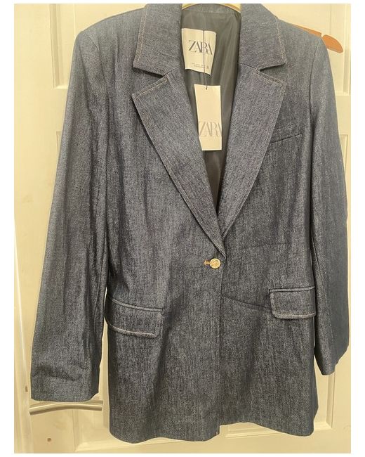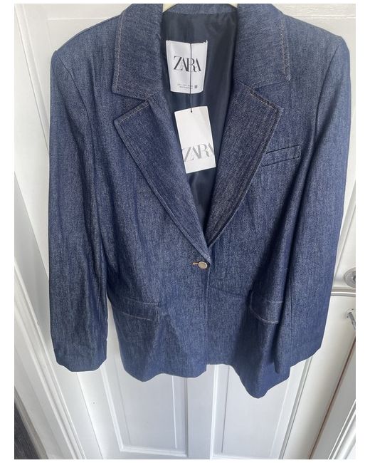 This Zara blazer is a perfect addition to your wardrobe. Made from high-quality cotton, this blazer is perfect for any occasion. The single gold button sets it off Brand new, never worn and in excellent condition. With a stylish denim colour, this blazer is suitable for women of all ages and sizes. The blazer is a basic jacket with a regular size type and is perfect for any season. Ideal for formal and casual events, this blazer is a must-have for any fashion-conscious woman. The brand name Zara guarantees quality and reliability, making this blazer a great investment for anyone looking for a stylish and comfortable jacket.