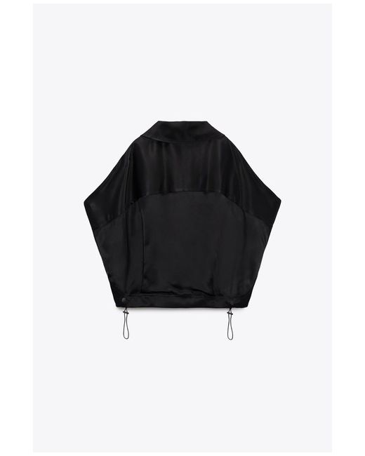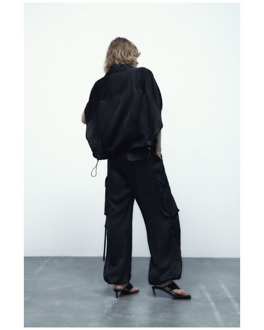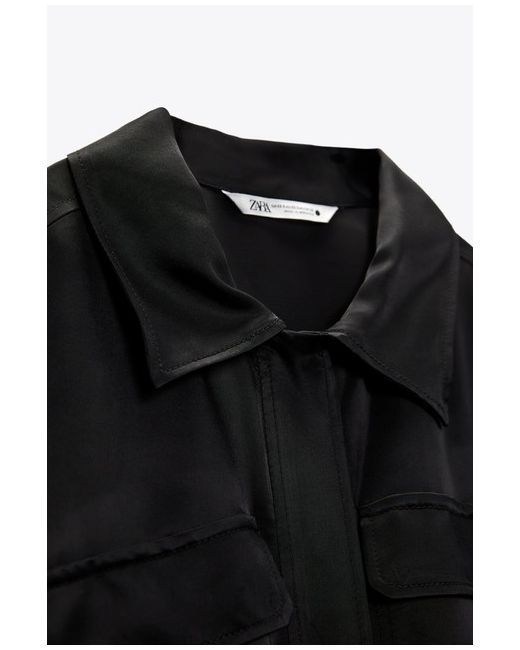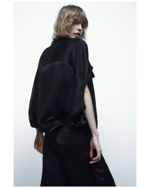 ZARA SATIN CARGO BLOUSE Collared blouse with short sleeves. Flap pockets on the chest in-seam side pockets. Adjustable hem with elastic drawstring and stopper. Front snap-button fastening hidden by a placket.