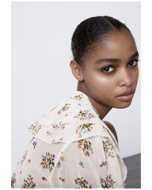 Zara Printed Ruffle Blouse Ecru Multi S. Zara Printed Ruffle Blouse with Metallic thread. Ecru with multicoloured print design all over. Beautiful blouse that can easily transition from work to night. New with Tags
