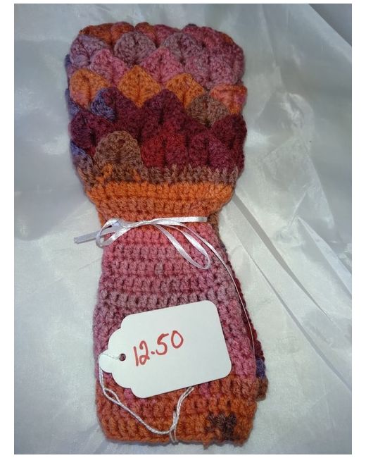 Stay warm and stylish this winter with these Hand Made Dragon Scale Fingerless Gloves/Wrist Warmers. The gloves are made of 100% Acrylic and feature a crochet fabric type with beautiful multicoloured accents. The gloves are perfect for casual occasions and come in one size that fits all. These fingerless gloves are perfect for women who want to stay warm without compromising on fashion. The gloves have a wrist-length style and feature a crochet design that adds a touch of elegance to any outfit. The gloves are suitable for winter, autumn, and spring seasons. Get your hands on these Hand Made Dragon Scale Fingerless Gloves/Wrist Warmers now and add a touch of beauty to your wardrobe. beautiful autumn colour.