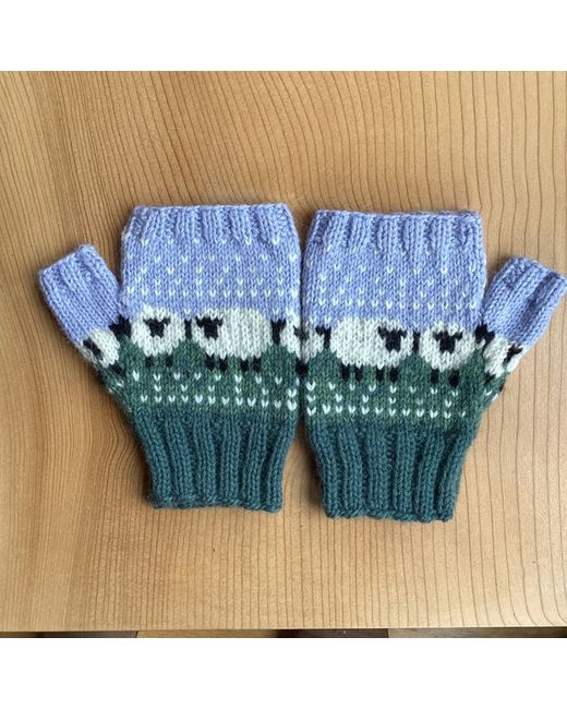 Sheep design. Handmade fingerless mitts in 100% wool. Shades of blue, green and white. Size medium.