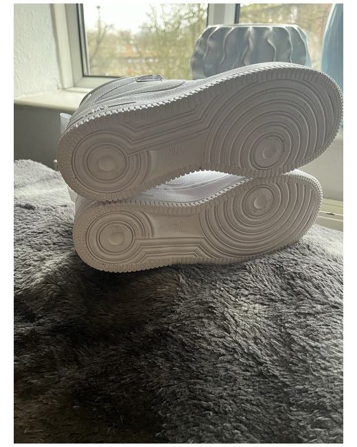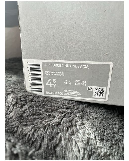 This is a pair of Nike Air Force 1 Highness trainers in white, designed for women in a UK shoe size 4. The style of the shoe is a classic sneaker with the iconic Nike Air Force product line. The model is specifically made for younger girls (GS) and features the well-known Nike swoosh logo. These trainers are a stylish and comfortable choice for casual wear or sports activities.