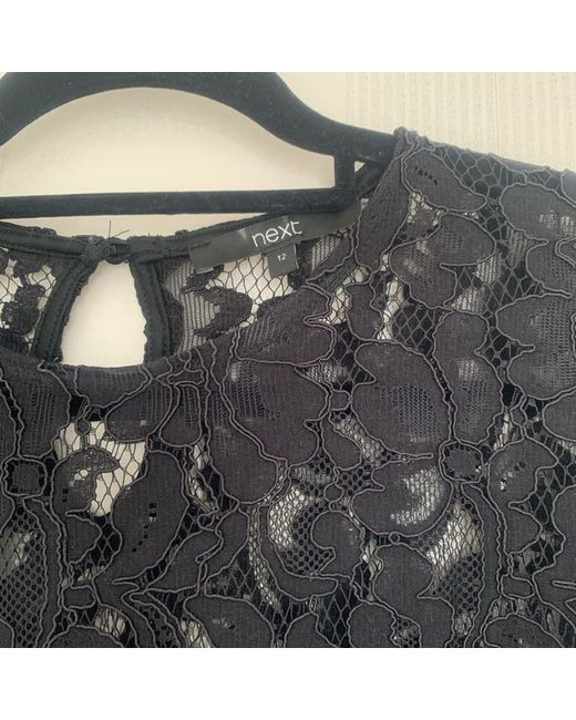 Elevate your wardrobe with this stunning black lace top from NEXT. Perfect for any occasion, this blouse features short sleeves and a flattering fit that is sure to turn heads. The intricate lace fabric adds a touch of elegance, while the size 12 ensures a comfortable and stylish fit for women of all shapes and sizes. Whether paired with jeans or a skirt, this top is a versatile addition to any wardrobe. Don't miss out on the chance to own this must-have piece.