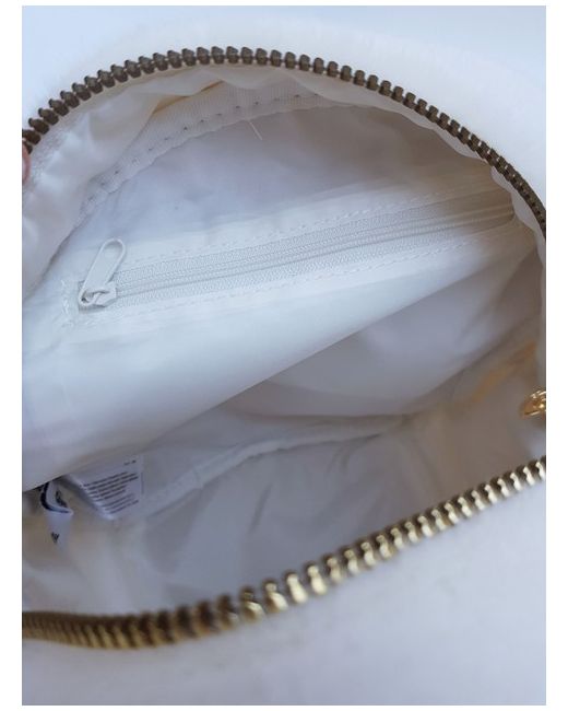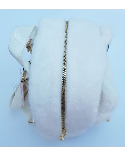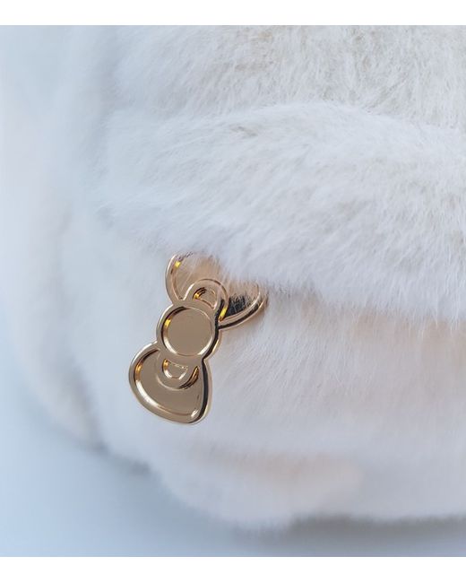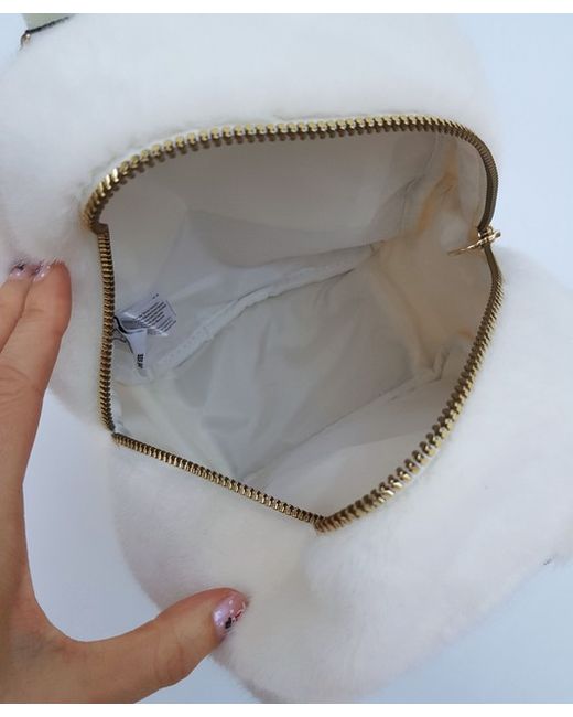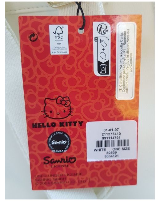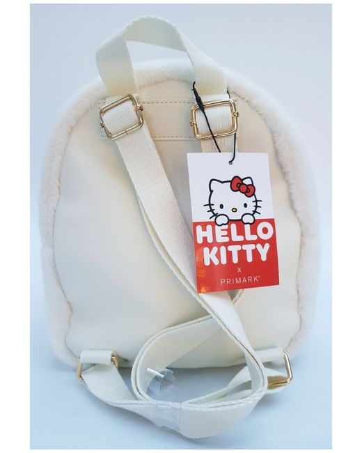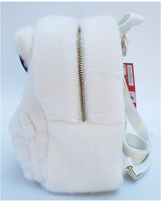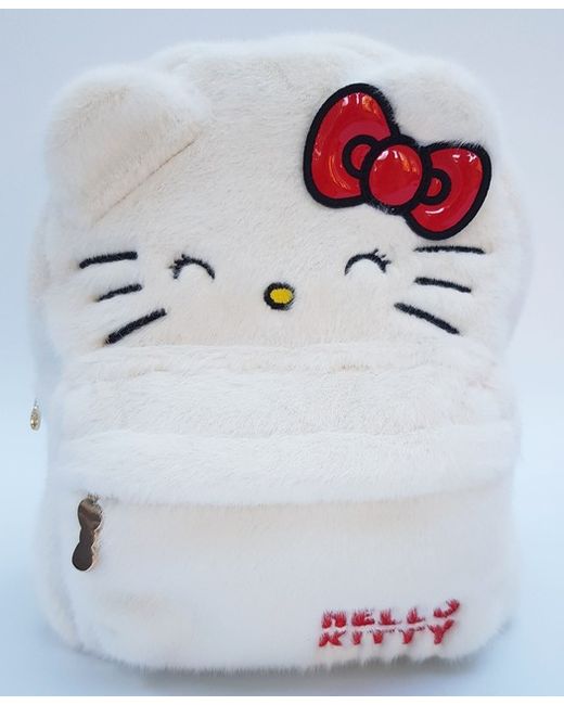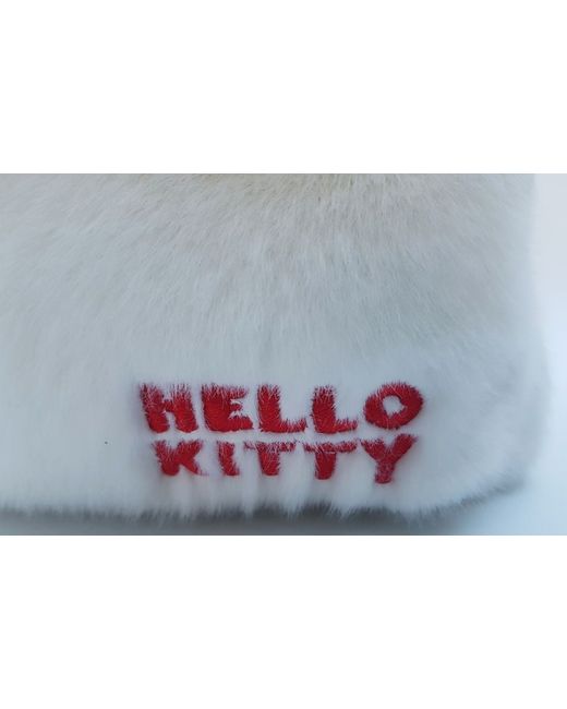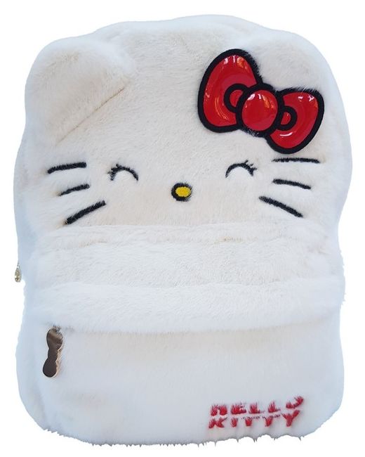 White furry fabric. Embroidered Hello Kitty text to the pocket. Shiny red bow under ear. Front zipped pocket.
