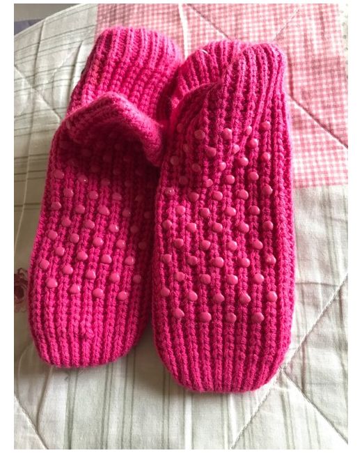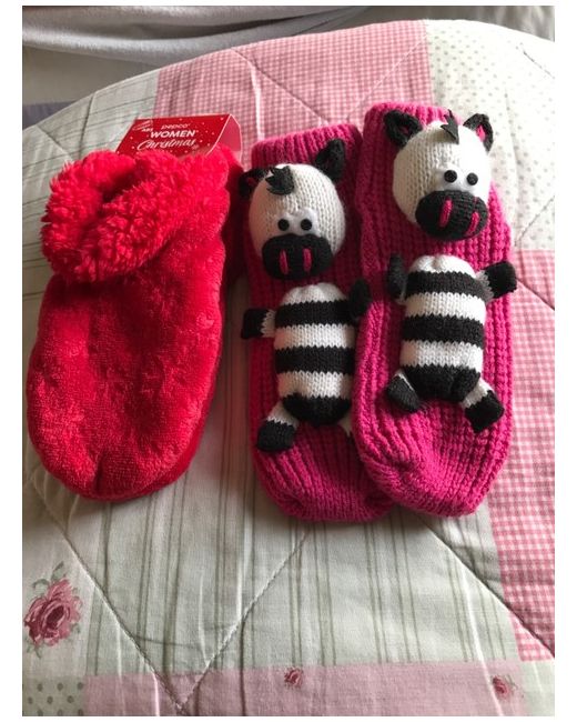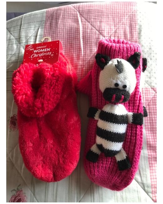 The red slip-on slippers are 100% super soft comfy polyester. These are both very comfortable and warm cosy slippers.