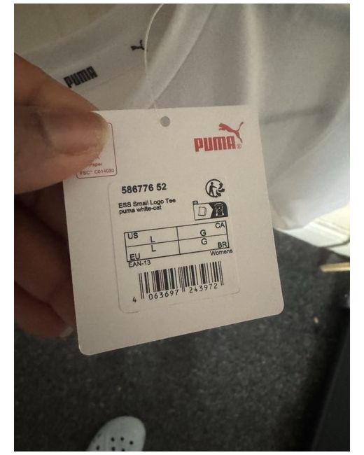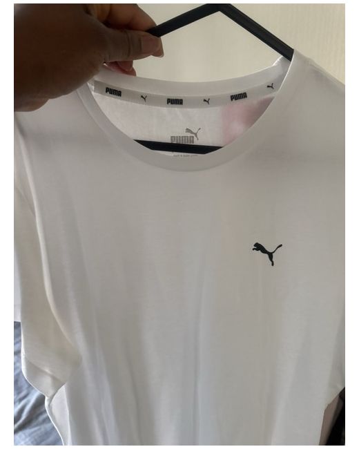 This is a new white PUMA T-shirt for women in size L. It features short sleeves and is suitable for regular wear.
