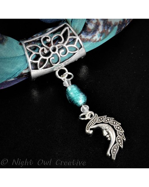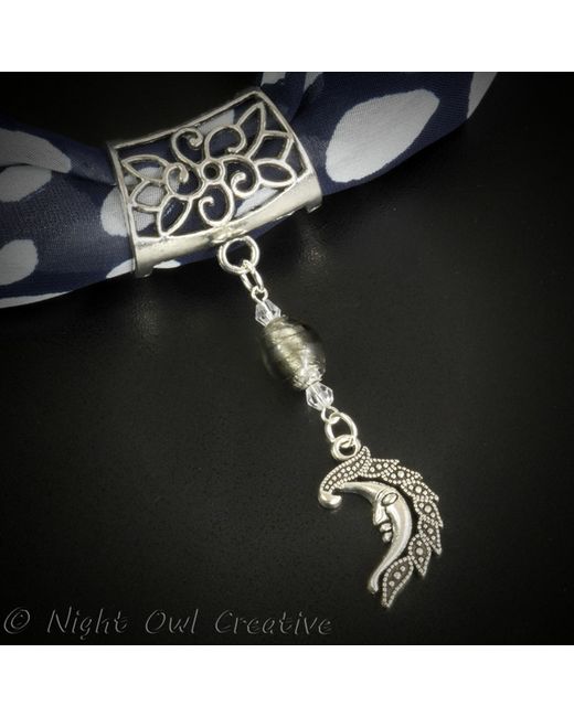 Man in the Moon Scarf Pendant, an adorable moon charm on a silvertone scarf slider bail with beading of foil lined frosted glass and sparkling clear cut crystal bicone beads. I have used a classic chiffon scarf for illustration in the main photo (scarf not included), but this will take a selection of scarves in the light to medium weight range. Simply slide your favourite scarf through the hollow bail, and tie or drape to your preference. Dimensions: Bail: 32 mm approx at widest, side rings 22mm diameter, hollow at back Moon Charm: 27mm x 16mm approx Overall length from top of bail to tip of moon: 8.5cm Colour Choices for Beading: Amethyst Purple, Smoke Beige, Dusky Rose Pink, Peacock Green.