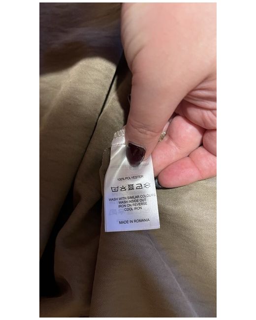 Bought this from tk maxx, never wore it. The arms caused a problem for me as my arms got a bit thicker recently, i feel like when I try to move my arms in it, it restricts my movements. However i love love love its colour and style and little details on the arms. I would describe colour somewhere between grey khaki and beige, which i find flattering. Size is 18, fabric does not stretch, so please be mindful of it when you purchase.
