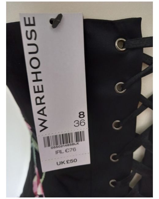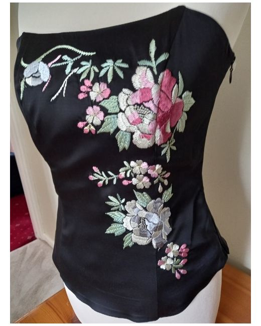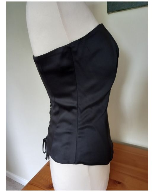 BNWT Warehouse exquisite embroidered black stretch satin lace up strapless bustier. This is a rare and stunning top which has an open ended zip at the side for easy dressing and satin ribbon lacing at the back so that it can be adjusted to fit snugly. It has five bones, two at the front, two at the back and one side bone to keep it securely in place. This is absolutely not to be missed, it's beautiful!