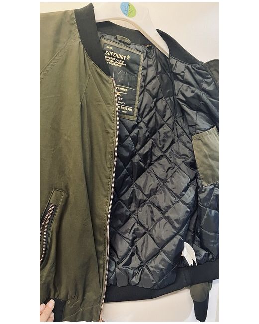 Stay stylish and comfortable during any season with this women's Superdry jacket in size L. Made from soft cotton fabric and lined with polyester, this mid-length bomber jacket features a full zip closure and zipped pockets for added convenience. The elastic waist and soft shell material provide a flattering fit, while the khaki colour and logo accents give it a designer touch. Perfect for travel, casual outings, or workwear, this all-season jacket is a must-have for any wardrobe. Whether you're exploring the great outdoors or simply running errands around town, this Superdry jacket is sure to keep you warm and looking fabulous.