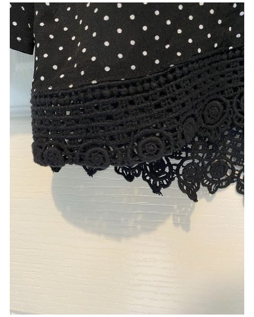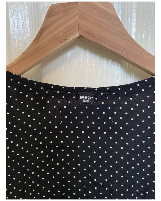 Superdry shirt in size 6. Polka dot pattern, flared sleeves, and V-neckline, button-down closure and lace trim accents. A lightweight polyester material. This cropped style shirt features a slim fit and is perfect for the preppy 50s theme. Spring and summer season.