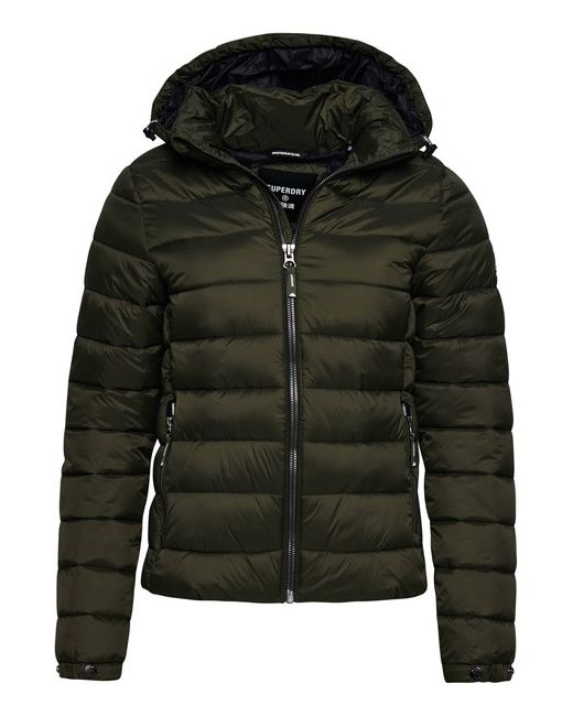 Signature Superdry badge. A puffer jacket is always a classic addition to your wardrobe, but choosing the right one for you is important. Bungee cord hood. The padding in this jacket is 100% recycled, each jacket contains over 30 recycled bottles, this avoids these bottles being sent to landfill or polluting our oceans.