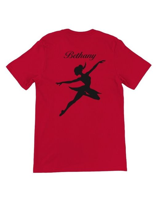 Add a touch of personalised style to your wardrobe with this red Bella + Canvas T-shirt. The double-sided shirt features a crew neckline and short sleeves, making it perfect for all seasons and occasions such as travel, parties, or casual outings. The shirt is made of comfortable cotton fabric and is machine washable for easy care. The T-shirt is perfect for women who love dancing and space exploration. The design features a ballerina character and the words "Dance to the Moon and the Stars" on the front, with a personalised touch that allows you to enter any name. This shirt is a great addition to any wardrobe and is perfect for showing off your unique style.