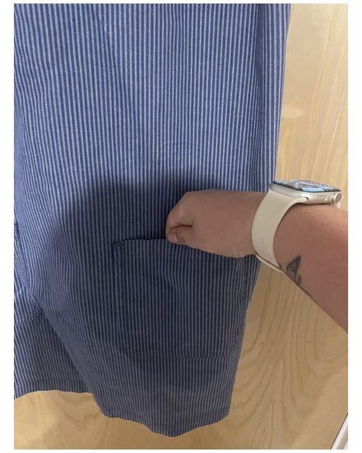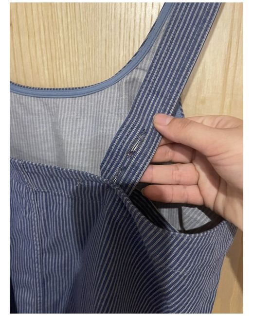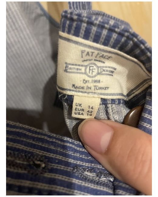 Fat Face Dress 14. Blue and white stripe dress with 2 pockets on the front. Has adjustable straps with buttons on the back can cross them over or not to help with fit.