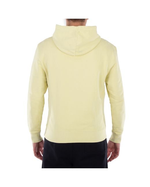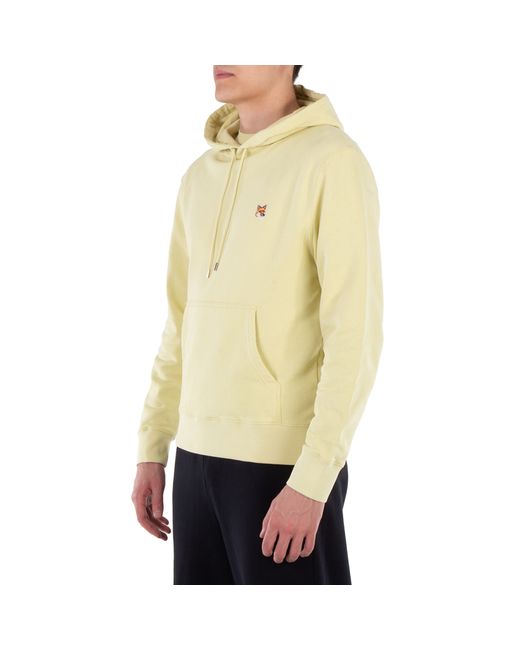 Maison Kitsune Mens Tops. Fashion category: Hoodies & Sweatshirts. SKU: LM00702KM0001-CHALK YELL. This long-sleeve cotton hoodie offers a classic cut, perfect for relaxed, everyday wear. It features an embroidered Fox Head patch at the chest, adding a touch of the brandâs signature style. The attached drawstring hood allows for an adjustable fit, while the kangaroo pocket offers convenience and warmth. Ribbing at the cuffs and waist ensures a comfortable fit. The back is plain, keeping the focus on the hoodieâs front details. 100% Cotton.