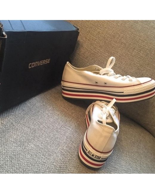 New, unworn, 2012/13 Converse All Star Platform Ox Wedge Shoes in White. Old style logo across the tongue of the trainers. Lovely addition to the shoe collection! Box comes with some superficial damage (as shown in a couple of the photos) from general movements across the years but shoes remains perfectly intact. UK Size 8.
