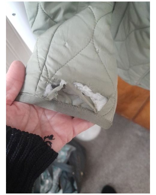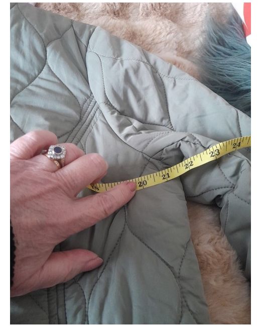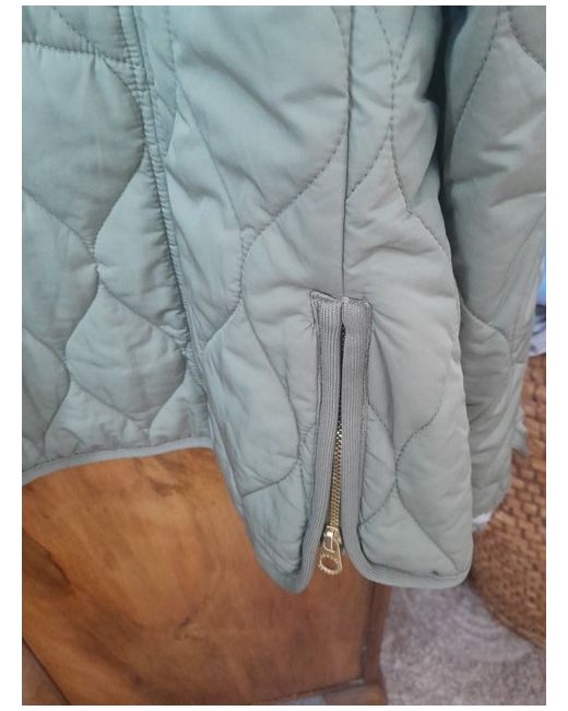 Lovely little jacket in soft olive green, lined in floral print. Pull adjustment on back. Nice shaping with round neckline and set shoulders. Zip to sides. Rounded hemline. Defect on cuff of one sleeve see pic, not too noticable if cuff is rolled back. Size 16 but id say its more of a 14 .