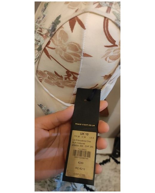 This is a Phase Eight women's A-line dress in size 10-12. It is knee-length and multicoloured, suitable for regular sizing.