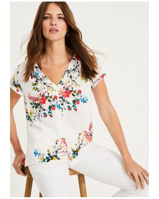 A smart floral print blouse designed with button detailing and ladder stitching on the short sleeves and across the back. Composition: 100% Viscose. Length: 63cm shoulder neck point to hem.