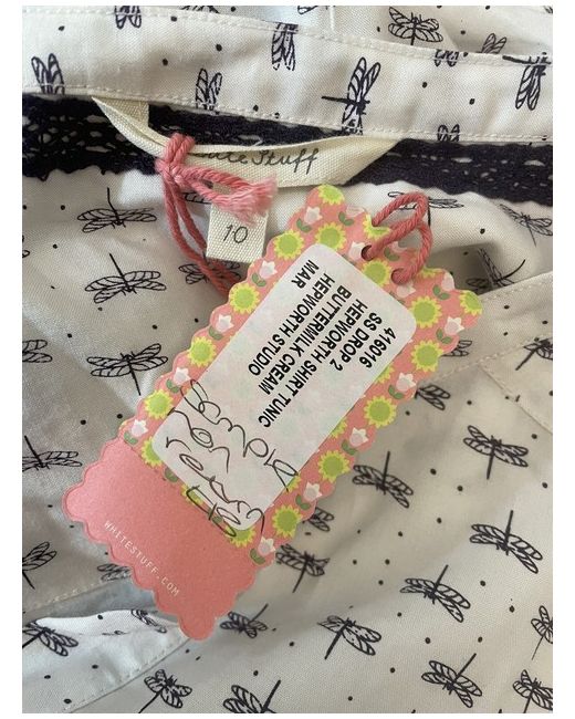 WHITE STUFF 10 BNWT SAMPLE Cream Dragonfly Print Long Tunic Shirt Blouse this is a one off sample Manufacturers colour; buttermilk cream No care label Lace tie belt Pit to pit 19” Centre back length 34” So there are a few notes: Small pen marks - should wash out with stain remover Top button is broken, can be replaced, but still does up and isn’t visible Slight mark on underarm which should wash out Sold as seen, no refund, please check photos