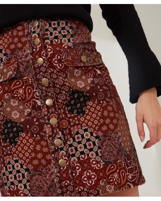 Bring autumn into your wardrobe with this elegant A-line skirt in a paisley patchwork print. Elegant A-Line: This skirt features gold buttons and a paisley patchwork print in stretchy velour fabric.
