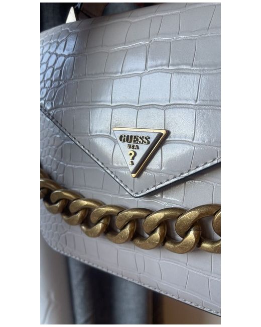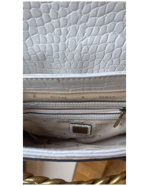 This stylish white GUESS top handle bag is perfect for any woman on the go. With a spacious exterior made from high-quality faux leather, this bag is both durable and fashionable. The gold hardware adds a touch of luxury, while the beige lining provides a stylish contrast to the exterior. The bag features a single top handle and strap, both made from the same faux leather material. It's perfect for carrying all your essentials, whether you're heading to work or out on the town. This bag is a must-have for any woman who wants to stay stylish and practical at the same time.