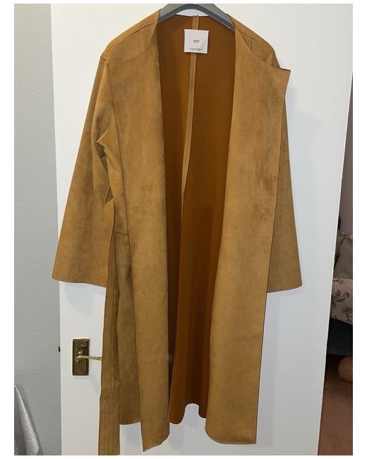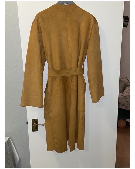 mango trench coat for women.Outer shell of coat suede. very soft and classy. Dark/mid shade yellow and has pockets on each side of the coat. Has a belt. Has a slight oversize feel. Size: S-M (8-12/14) depending on body shape and how tight or loose you would like to wear it.