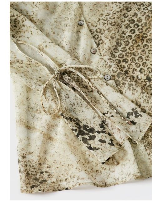 This Mango blouse is a must-have for any fashion-forward woman. With a stunning green animal print and sheer chiffon fabric, this top is perfect for any occasion. The V-neckline and long sleeves add a touch of elegance, while the regular fit and size M make it comfortable and versatile. This blouse is a statement piece that can be dressed up or down. The sheer fabric and features like the long sleeves and V-neckline make it suitable for any season.