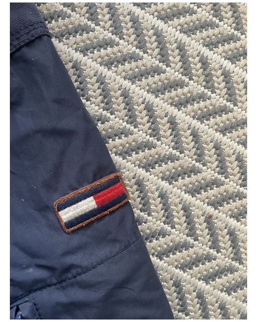 This is a new Tommy Hilfiger coat with defects. It is a women's L size basic jacket made of polyester with a denim fabric type. The coat has long sleeves, a zip closure, and is blue in colour.