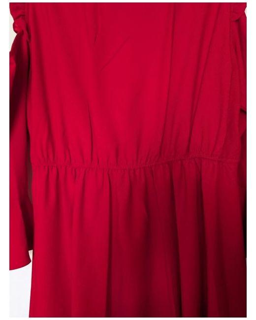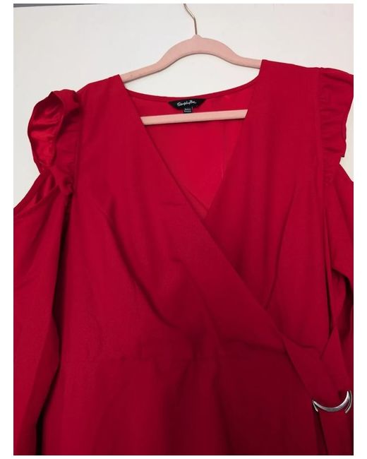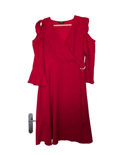 Red Cut-Out Sleeve Faux Wrap Style Dress 12 This is a very lovely red midi dress from Simply Be in size 12. It has a faux wrap-front style and a v-neck neckline. The sleeves are 3/4 length and are cut-out at the shoulders with a little ruffle frill.
