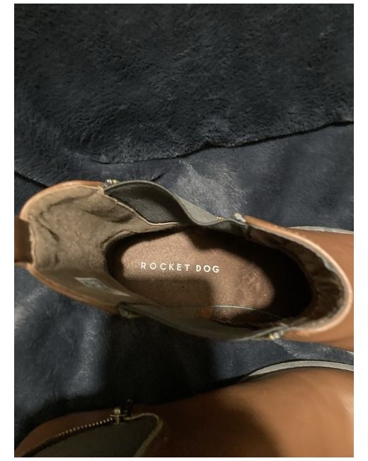 A pair of Rocket Dog Chelsea boots for women in size 7 UK (9.5 US, 40 EU). The boots are brown in colour with a faux leather upper and a low heel style. They feature a round toe shape, pull-on closure with a zip accent, and synthetic lining and insole material. The model is called Chelsea and the brand is Rocket Dog. Made in China.