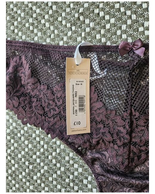 This Debenhams thong in size 18 is perfect for a woman who wants to add a touch of elegance to her lingerie collection. Crafted from delicate brown lace, this thong is stylish and comfortable to wear. The brand name ensures that you are getting the highest quality product. This thong is perfect to wear under any outfit, providing a seamless look. The intricate lace detailing adds a touch of femininity to your wardrobe, making it perfect for any occasion.