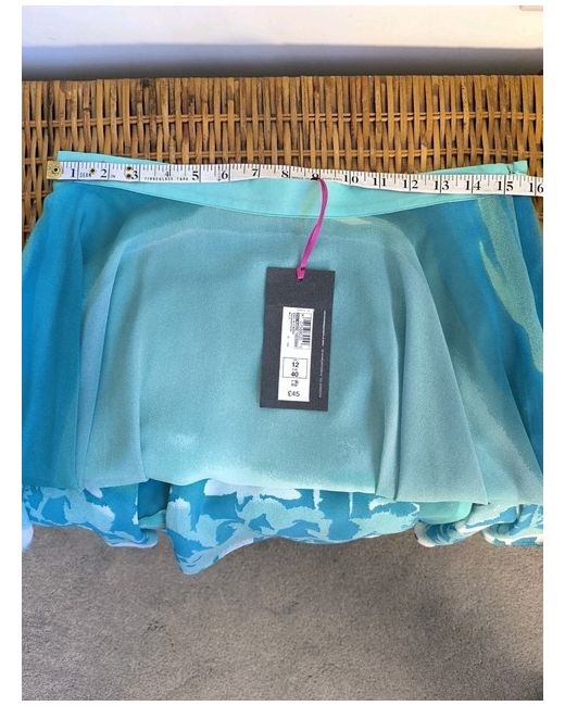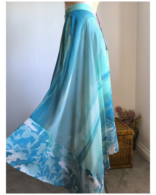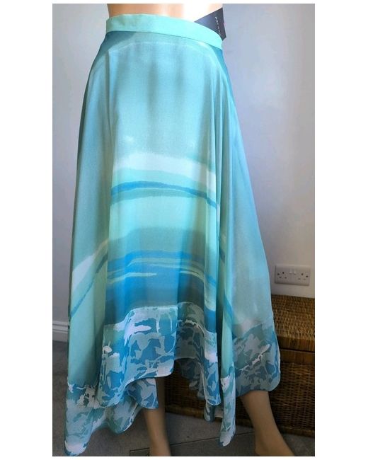 Per Una floaty flare skirt, a stunning piece that captures the essence of a blend between classic sophistication and playful charm. The skirt is presented in a delightful blue and green mix, adorned with a vibrant floral pattern that evokes the spirit of a tropical paradise.