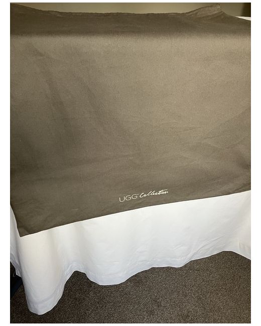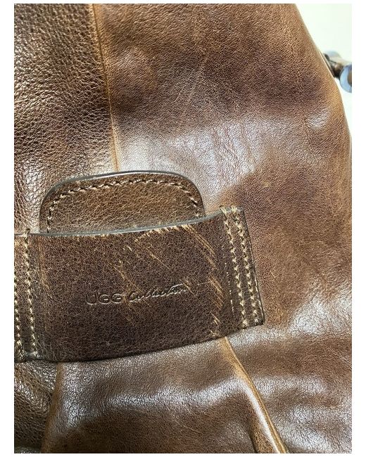 This UGG Australia large leather bag is a stylish addition to any wardrobe. The solid brown exterior leather material is complemented by brown toggle closure hardware and double handles. The bag has a large size of 37cm in width, 36cm in height, and 15cm in depth, making it perfect for carrying essentials. The bag features inner pockets for added convenience and is handmade with high-quality materials. The suede lining in purple adds a touch of elegance to the bag. This top handle bag is perfect for women who want to make a fashion statement while carrying their everyday items. Comes with dust bag