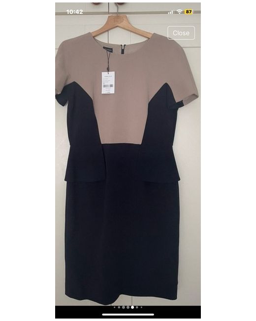 Elevate your wardrobe with the sophisticated charm of the Hobbs Dress and Jacket set, a perfect ensemble for various occasions, from business meetings to weddings. The knee-length dress, cut in a size 12, features a comfortable round neck and short sleeves, crafted from a blend of polyester and viscose for a smooth, yet breathable fit. Its beige and navy colourblock design exudes a modern yet classic vibe, suitable for spring and autumn events. The coordinating jacket, in a size 14, complements the dress with its long sleeves and timeless silhouette. Both pieces are lined for an extra layer of comfort and finished with a discreet zip closure. For lasting luxury, the garment requires dry cleaning, ensuring it remains a go-to choice for your formal and workwear collections.