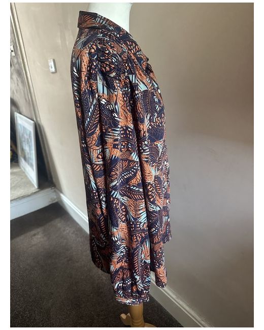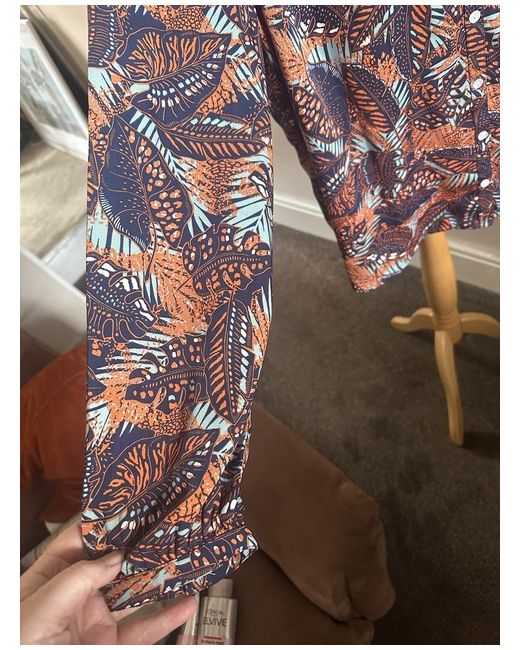 Update your wardrobe with this stylish ladies Damart top in tan brown and navy with a leaf pattern. This button-up top features long sleeves with a collared neckline, making it perfect for any occasion - whether it's a formal event, a party, or a casual day out. The top is made of polyester material, ensuring it is machine washable and easy to care for. It has a regular fit and is available in size 20. This top is versatile and can be worn throughout the seasons, whether it's autumn, winter, summer, or spring. It is a basic style that can be dressed up or down, making it a great addition to any wardrobe. Make this ladies Damart top your go-to for workwear or business attire, or wear it for travel and wedding events.