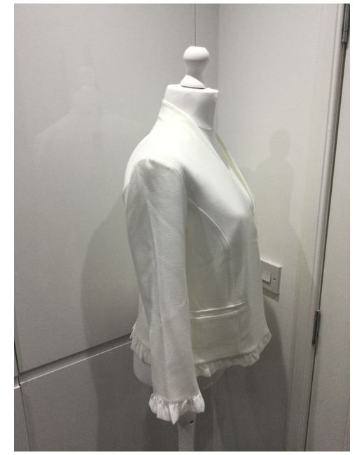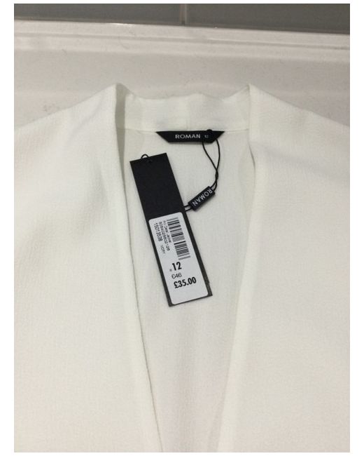 This beautiful white Roman ladies jacket is a must-have for your wardrobe. The jacket has a box style and is made of lightweight polyester material, making it perfect for both summer and spring. The jacket features long sleeves and an open closure, making it easy to wear and comfortable. It is perfect for any occasion, whether you're going to a party, a casual event or a formal occasion. The jacket is machine washable. This jacket is perfect for women who wear size 12, and the collarless feature and ruffle trim on the sleeve and jacket gives it a unique look. Get this BNWT Roman Ladies Jacket size 12 today! Excellent condition from a smoke free home.