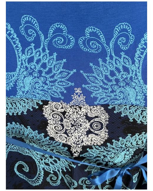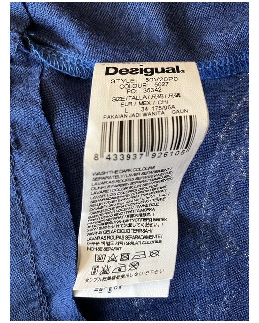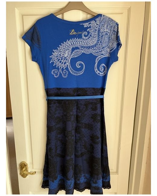 Beautiful Desigual jersey dress featuring distinctive turquoise and white design on front and back. A-line style with scoop neck and cap sleeves. Blue/black lace printed overlay effect on the skirt area with black lace trim around the bottom. Detachable ribbon belt. Bust: 85cm (33.5”) Waist: 78cm (30.75”) Hips: 94cm (37”) Length; 99.5cm (39”) Fabric: 100% viscose Machine washable at 30 degrees